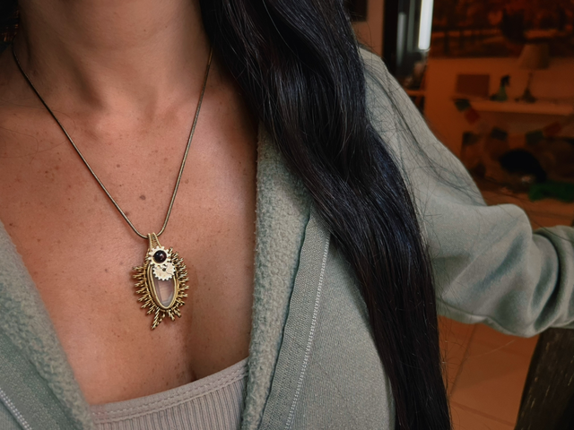 This piece comes with a free brass chain. If you prefer a more artisanal style, you can request a handmade adjustable macramé necklace crafted with Brazilian cord, with optional back decorations. The macramé necklace is available for an additional €10.