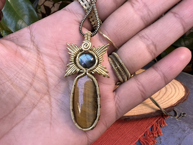 Wrapped in high-quality brass wire, this piece keeps its warm golden shine and comes with a matching brass chain. You will also find an adjustable macramé necklace option in the purchase menu. If you choose it, please contact us to select the back decoration you prefer; photos of the available decorations are included in the product gallery.